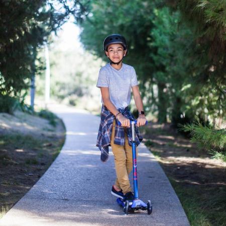Na Maxi Micro dziecko skręca balansując drążkiem kierownicy na lewą lub prawą stronę. Kółka przednie są większe od tylnego, co ułatwia pokonywanie niewielkich nierówności terenu.