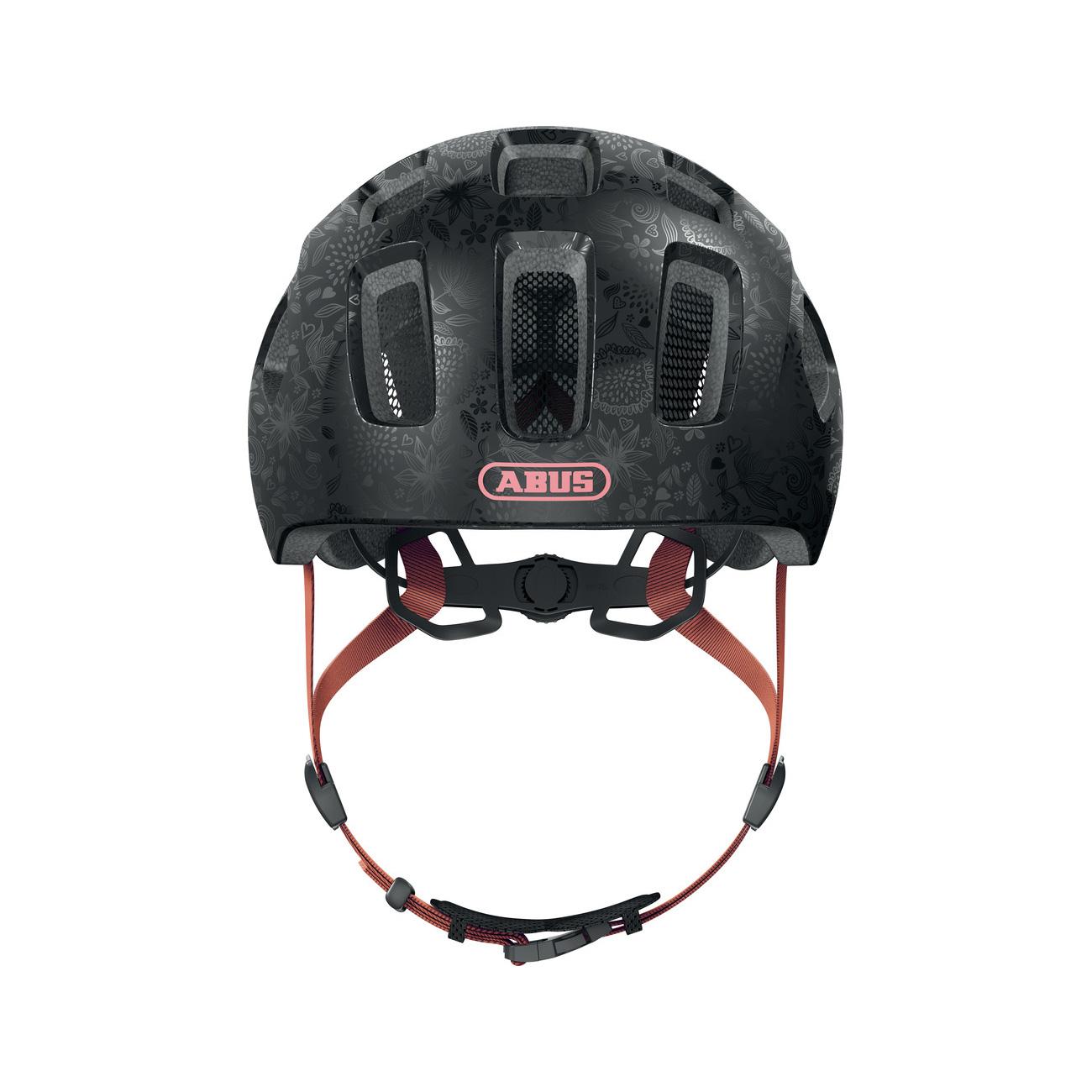 Kask dla dziecka Abus Youn-I 2.0 flower art (czyli czarny matowy, z błyszczącym wzorem kwiatowym oraz paski w kolorze pudrowego różu) w technologii in-mold, posiada 17 dużych otworów wentylacyjnych, mocniej zabudowaną potylicę, lampkę LED, miękkie paseczki i klasyczną klamerkę. Kaski Abus Youn-I dostępne są w rozmiarach 48-54 i 52-57 cm. Waga ok 260 g.